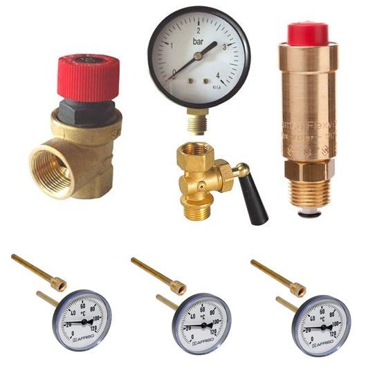 Komplektis kaitseklapp, manomeeter, ventiil, õhueraldi ja termomeetrid 3 tk. Kaitseklapi avanemisrõhk ei tohi ületada seadmele lubatud töörõhku !!!